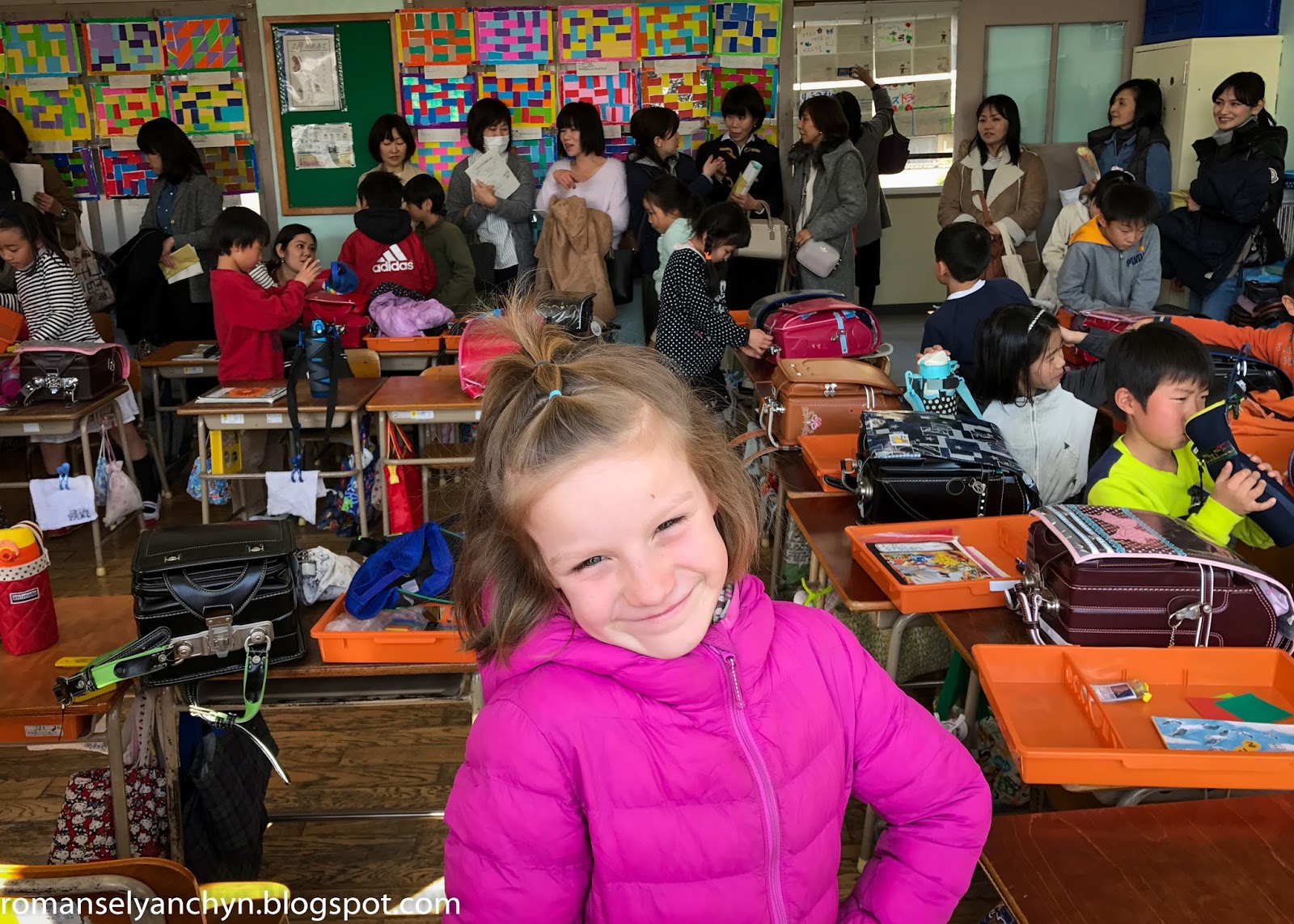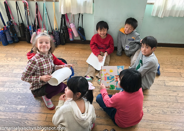 Загальноосвітні, початкові (1-6 класи) школи в Японії всі однакові. В них ходить 95 відсотків дітей, лише невелика частина відвідує якісь спеціальні школи по типу наших гімназій, ліцеїв, творчих шкіл та ін. В нашій школі вчиться близько 1000 дітей, в Марькиному класі 37 чоловік.
