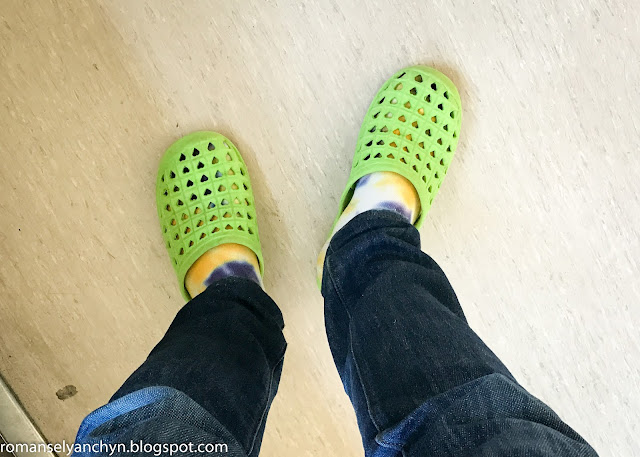 В школі діти використовують змінне взуття і для батьків винятку не роблять. Кожен має принести з собою тапочки, а своє взуття гарно запакувати хто куди, і носити з собою (!). Я наприклад, кладу в свій постійний рюкзак. А це мої улюблені зелені тапочки з сердечками з 100 єнового магазину.