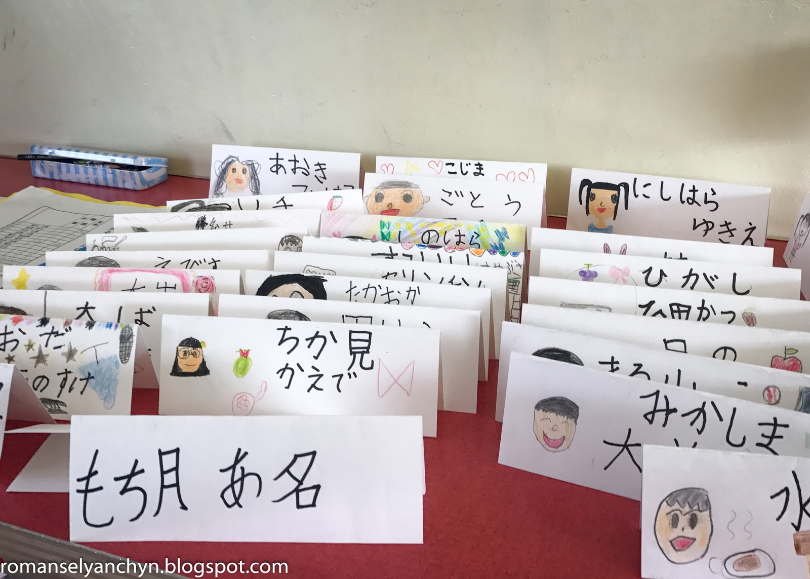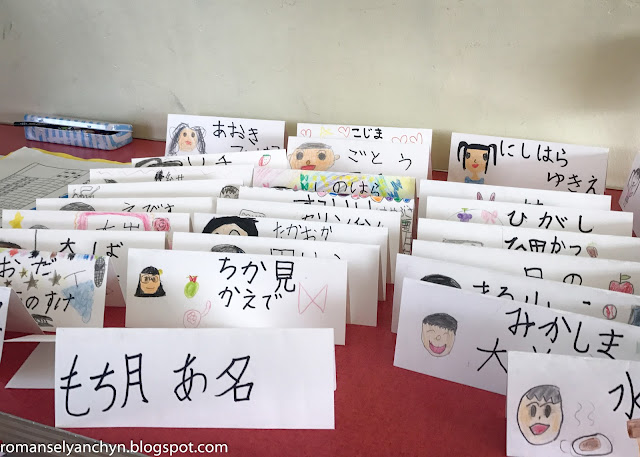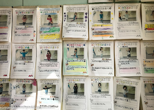Хто нудьгує може полюбуватися на різні роботи дітей що висять в класі або в коридорі. Малюнки, історії, ієрогліфи (каліграфія) або ж особисті плани на семестр - як ось тут. Марія написала що хоче навчитися гарно писати і вдосконалити математику.