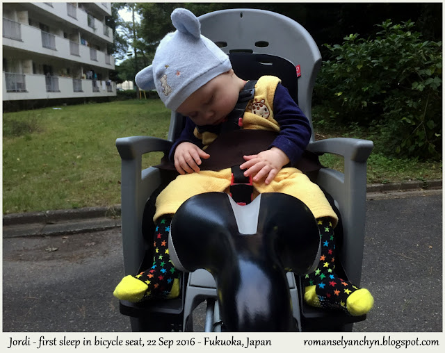 З малою дитиною планувати важко. І як правило все, що трапляється в житті в цей час повязано з дітваком. Місяць тому почав повзати. Два тижні тому - сидіти. Тиждень тому - на велосипеді. Сьогодні вперше проїхали кілометрів 15 і ось тепер вже маємо перший сон на велосипеді. Так спала колись наша Марія а тепер вона вже їздить самостійно. Все повторюється. Час біжить а ми ще все в Японії.